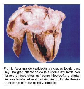 Corazón de tamaño aumentado: peso 500 g contra un peso esperado de 350 g (Fig. 2). La cardiomegalia se debe esencialmente a dilatación de las cuatro cavidades cardíacas. Predomina la dilatación de la aurícula izquierda, con fibrosis endocárdica y parietal, pero hay también una importante dilatación de las cavidades derechas: aurícula y ventrículo.