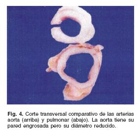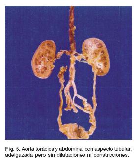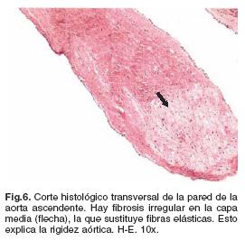 Hay adelgazamiento de la aorta ascendente, en relación con la arteria pulmonar (Fig. 4): en un corte transversal, la pared de la aorta tiene un espesor de 0.4 cm y la pulmonar de 0.2 cm. Al corte, el diámetro exterior de la aorta es de 2 cm y la luz de 1.2 cm. El diámetro externo de la arteria pulmonar es de 2.5 cm y el diámetro de la luz, de 2.1 cm. El adelgazamiento de la aorta se continúa en toda la arteria, es decir, en el cayado, la aorta descendente y la abdominal: adelgazamiento de tipo tubular (Fig. 5). No hay evidencia de placas ateromatosas. Un corte histológico transversal de la pared de la aorta ascendente (Fig. 6) muestra fibrosis irregular de la capa media.