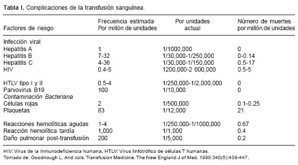 La mayoría de estos pts transfundidos se comporta bien después de la QxC sin ninguna aparente evidencia de complicaciones relacionadas a la TS. Sin embargo el seguimiento clínico de éstos ha permitido identificar una alta incidencia de complicacionesrelacionadas a la transfusión que se presentan en estos pts, siendo las más importantes: secundarias a una transfusión equivocada, las infecciosas, hematológicas e inmunológicas, entre otras2 (Tabla I). Así también no se puede ignorar la gran preocupación hospitalaria que existe ante un constante incremento de costos por la alta demanda de productos sanguíneos y el consecuente aumento en la estancia intrahospitalaria.