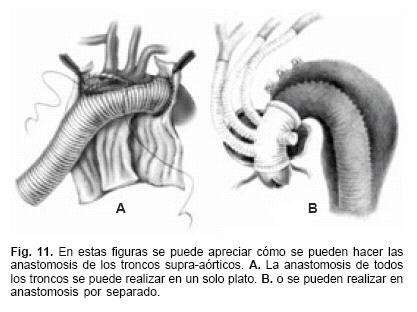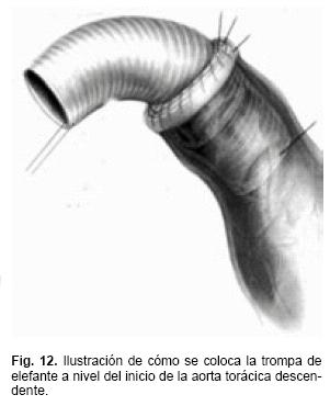 A toda esta diversidad de técnicas se les han agregado muchas más con la finalidad de poder lograr una reconstrucción adecuada del arco aórtico con una anastomosis en forma de plato de los troncos supraaórticos, o en su defecto con anastomosis específicas de cada uno de los troncos (Fig. 11), lo que nos ha llevado a tener mortalidades menores al 5% en pacientes programados. Una vez resuelto el problema de los troncos supraaórticos, se comenzó a tratar de resolver el problema del manejo de la aorta torácica descendente por vía anterior, no fue sino que a mediados de los 80 cuando se comenzó a utilizar la técnica denominada Trompa de Elefante, la cual permite hacer la cirugía del arco aórtico y/o de la aorta ascendente, protegiendo un segmento de por lo menos 5 a 10 cm de la aorta torácica descendente (Fig. 12); esta técnica ha tenido una buena aceptación en el manejo de la enfermedad dilatada de la aorta ya que para poder introducir el injerto de dacrón en forma de trompa de elefante a nivel del primer segmento de la aorta torácica descendente dilatada, es relativamente sencillo, no siendo así cuando se trata de una disección de aorta.28