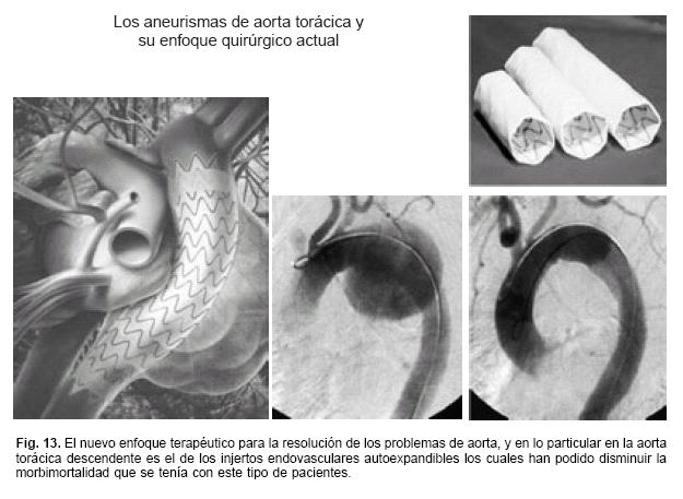 En los últimos años y con el nacimiento de los injertos endovasculares autoexpandibles (Fig. 13) se ha podido tener la posibilidad de proteger una mayor cantidad de aorta descendente, por lo que en el caso de que se tenga que manejar el aneurisma torácico por vía anterior porque también éste enferma la aorta ascendente y/o el arco aórtico el injerto endovascular se coloca durante la cirugía; esta técnica tiene dos ventajas importantes con respecto de colocar el endovascular por vía femoral: