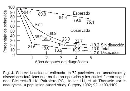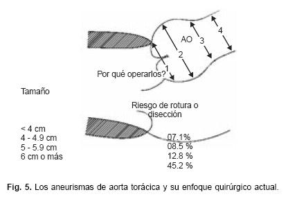Las razones de porqué a los pacientes que cursan con una enfermedad aneurismática de la aorta deben de ser tratados, son porque en los últimos años se han hecho varios estudios para analizar la incidencia de morbimortalidad de estos enfermos comparados con los que no presentan dilatación aórtica; y se ha encontrado que los pacientes que tienen aneurismas grandes de la aorta tienen un riesgo de 74% de ruptura en los siguientes 5 años después del diagnóstico; de los cuales el 94% de los pts que se rompieron murieron13 (Fig. 4), por lo que una vez establecido el diagnóstico, el paciente tiene que ser manejado lo antes posible antes de que se presenten alguna de las dos complicaciones más graves. Por otro lado, el tamaño de la aorta también es un factor muy importante en el riesgo de ruptura; se ha encontrado que una aorta torácica que mide entre 5 a 5.9 cm tiene 40% más riesgo de ruptura que aquel paciente en donde su aorta mide menos de 5 cm; aun así y más importante es que las aortas que miden más de 6 cm tienen un riesgo de ruptura y/o disección de 45% por año. Por lo que en la actualidad se ha llegado al consenso que en pts en los que su aorta mide más de 5 cm se debe considerar la posibilidad de un tratamiento más agresivo, que sólo el tratamiento médico, y aquellos que tienen por arriba de 6 cm deben de ser tratados lo antes posible14 (Fig. 5).