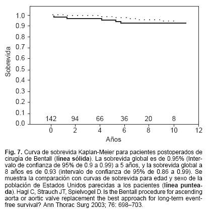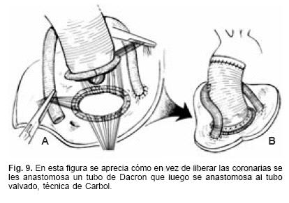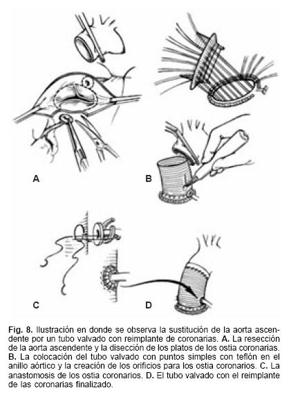 En los casos de enfermedad de la raíz de aórtica y de aorta torácica ascendente, el tratamiento es eminentemente quirúrgico y la técnica realizada durante la operación dependerá si está afectada la válvula aórtica y/o los senos coronarios. Se ha logrado hacer su sustitución de la válvula aórtica con reimplante de coronarias y de la aorta ascendente (técnica de Bentall y DeBono16 (Fig. 7), con un tubo valvado, utilizándose válvulas biológicas o mecánicas, obteniéndose resultados de excelencia (Fig. 8), con mortalidades de menos de 4% en cirugías programadas y de menos del 10% en cirugías de urgencias. Esta técnica fue diseñada hace más de 30 años y ha demostrado un beneficio importante para los pacientes con esta patología.17 En el caso de que no se puedan movilizar adecuadamente los ostia coronarios, se ha creado una técnica alterna (Cabrol) en donde en vez de implantar los ostia coronarios al tubo valvado, éstos se anastomosan a un tubo artificial el cual a su vez se anastomosa al tubo ya colocado18 (Fig. 9); uno de los últimos procedimientos que se han diseñado para el manejo de estos pacientes, es el intentar la conservación de la válvula aórtica nativa realizando la resuspensión de la misma (Fig. 10), teniendo resultados aceptables a corto y mediano plazo.19