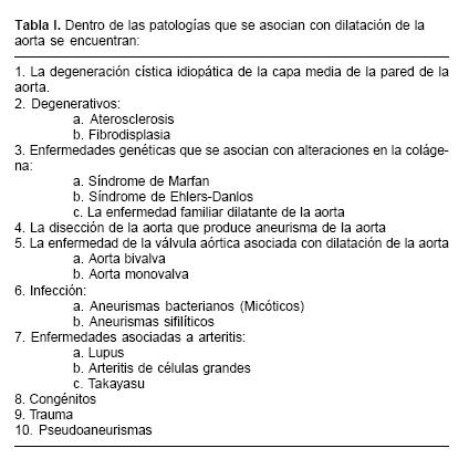 La aorta es un órgano que tiene una gran resistencia y distensibilidad para poder tolerar las grandes presiones y flujos a los que es sometida, esta particularidad es derivada de las características únicas de su capa media, la cual está constituida por una capa laminar de elastina, colágeno, células de músculo liso y fibrina;9 esta capa es más gruesa en las porciones más proximales de la aorta y se va haciendo más delgada conforme la aorta se aleja del corazón.10 Estas características hacen de la pared de la aorta una entidad biológica muy activa, en donde las células de músculo liso sintetizan y degradan la elastina, el colágeno y los proteoglicanos de la capa media de la aorta.11 La fragmentación de alguno de estos productos o la alteración en la función de las células de músculo liso producen un debilitamiento de la pared de la aorta con una degeneración cística de la capa media que se puede convertir en una necrosis cística. Con el debilitamiento de la pared de la aorta y la pérdida de su elasticidad se produce un aumento en la tensión relativa sobre su pared derivado de la ley de Laplace, lo cual facilita más dilatación y más tensión a nivel de las capas de la aorta hasta que ocurre una disección y/ o una ruptura de la pared12 (Tabla I).