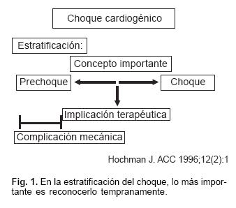 Cardiogenic shock (CHC) associated to acute myocardial infarct has high mortality and their manifestations are heterogenous. In our institution historical mortality, was 98%, but with different methods of reperfusion, its reduced to 53%. In other hand, with opportune clinical stratification is useful to improve the treatment strategy. This stratification on basis in clinical signs: age, infarction location, cardiac frequency and systemic arterial pressure, and hemodynamical valuation with the use of right catheterism with quantification miocardial work parameters like "Cardiac power" that is the product of flow and arterial pressure and that is of utility to know the "Miocardial reserve". In our experience after reperfusion procedure patients with CHC and cardiac power less than 1.0 had highly mortality.