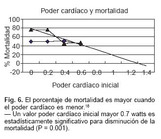 En otra experiencia preliminar Chuquiure y cols,20 determinan la reserva miocárdica en 62 pts con (IAMCE/ST) y con extensión al VD con compromiso hemodinámico y se observó que en los 21 pts que sobrevivieron el poder cardíaco se incrementó después de la ACTP a 1.3 + 0.48 vs 0.70 ± 0.29 en los que murieron (p < 0.05), además determinó la utilidad de calcular el índice de poder cardíaco (IPC), el que se obtiene al dividir éste por el área de superficie corporal 0.80 + 0.29 en el grupo que sobrevivió vs 0.42 + 04.18 en los que murieron (p< 0.05).