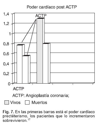 En la Unidad Coronaria del Instituto Nacional de Cardiología, se estudiaron en un período de 4 años consecutivos a 71 pts con CHC secundario IAMCE/ST, se determinó el poder cardíaco y en los 21 pts que sobrevivieron después de realizar ACTP se observó que el poder cardíaco aumentó (Figs. 6 y 7).18