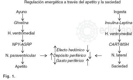 El balance entre los estados de apetito y saciedad, está regulado por el hipotálamo y su ruptura puede inducir estados de obesidad o de caquexia. El hipotálamo ventromedial recibe por vía endocrina asa aferente, la información periférica sobre el balance energético. Dicha información es procesada en los núcleos hipotalámicos, periventricular y lateral y emite por vía paracrina asa intrahipotalámica, información a otras zonas del hipotálamo, al sistema límbico y/o al sistema nervioso periférico con el fin de equilibrar el estado energético de nuestro organismo asa eferente.10,11