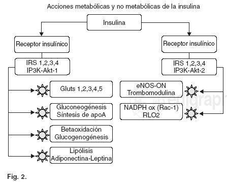 Los AGL no saturados (ácido linoleico y eicosapentanoico), son estímulos potentes para la secreción y sensibilización de y a la insulina,3537 sin embargo los AGL saturados (laurato y palmitato), si bien inducen síntesis y secreción insulínica, también provocan resistencia celular a la hormona por interferir con la acción de su principal enzima orquestadora intracelular, la PI3K o "PhosphatidilInositol3Kinase".38,39 Este fenómeno no sólo provoca RI en las células del eje metabólico y en las células endoteliales, también provoca inhibición del efecto aferente (perifériconeural) de la insulina y la leptina sobre el núcleo ventromedial y por ende bloquea sus señales anorexigénicas, antihedónicas e incrementadoras del gasto energético de reposo.40,41