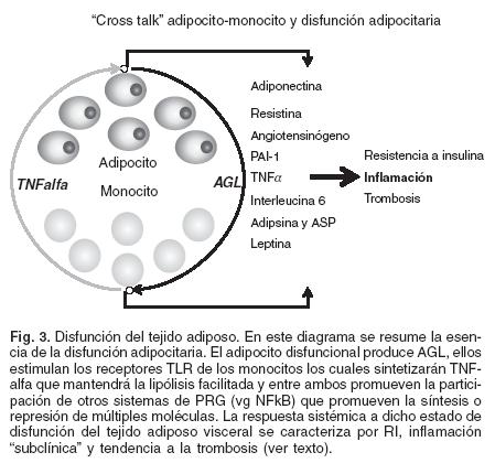 De esta forma se establece en el tejido adiposo visceral una nociva intercomunicación o "crosstalk" adipocitoleucocito en la cual, los AGL favorecen la síntesis de TNFalfa por el monocito y dicha citoquina perpetúa el ciclo induciendo al adipocito para la síntesis de citoquinas leucoquimiotácticas, retroalimentando la lipólisis, inhibiendo la síntesis de adiponectina y estimulando la síntesis de otras moléculas con potencial proinflamatorio, vasoconstrictor y protrombogénico.102104