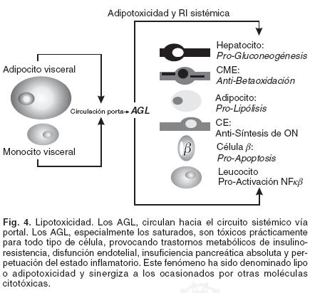 A niveles plasmáticos altos, los AGL circulantes, especialmente los saturados, tienen efectos citotóxicos directos conocidos como lipotoxicidad. La lipotoxicidad provoca lesión anatomofuncional, tanto en las células del eje metabólico (adipocitohepatocitomiocito esquelético), como en otras estirpes celulares (leucocitos, células endoteliales y células beta). Su efecto sinergiza a los ya referidos para las citoquinas como el TNFalfa, la IL6 y favorece la activación de la NADPHoxidasa leucocitaria y la producción de RLO2 (radicales libres de 02).