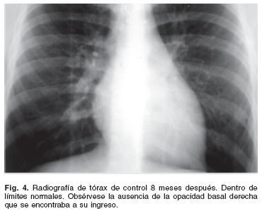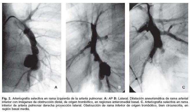 Masculino de 14 años; con antecedente de púrpura trombocitopénica a los 7 años de edad. Inicia padecimiento de dos años de evolución, con palidez de tegumentos, fiebre de predominio vespertino, pérdida de peso (10 kg), astenia, adinamia, eritema y úlcera en narina derecha, no dolorosa, acompañada de epistaxis, estomatitisaftas y úlceras bucales, no dolorosas, dolor articular difuso, conjuntivitis intermitente sin respuesta a múltiples tratamientos; 4 meses antes con tos seca y posteriormente con esputo hemoptoico, dolor a la inspiración en hemotórax derecho. Presenta evento de hemoptisis severa, causa por la cual ingresa a urgencias donde se le encuentra pálido, con caquexia, fiebre de 38.5oC de predominio vespertino, con dolor intermitente en hemitórax derecho, con mareo e hipotensión a la inspiración profunda. Úlcera en comisura bucal derecha, con estomatitis y aftas en mucosa oral. Estertores finos y murmullo vesicular disminuido en hemitórax basal derecho. Ruidos cardíacos rítmicos con FC 115x' (sin fiebre), sin soplos, 2do ruido normal. Extremidades con dolor a la movilización y tacto en rodilla y carpo derecho. Radiografía de tórax sin cardiomegalia, con opacidad circular basal derecha de 2 cm (Fig. 1). Laboratorio reporta una Hb 9.78 g /dL leucocitos 6,560, 68% segmentados, plaquetas 253,000, fibrinógeno 813, VSG 42 y 67 mm/h. Otros negativos. Gammagrafía pulmonar con hipoperfusión en segmentos medial, basal posterior y anterior basal derecha e izquierda. Ecocardiograma modo MB Doppler color con diagnóstico de <<tumoración>> en ventrículo derecho. Se envía a cateterismo cardíaco para valoración por probable malformación arterial pulmonar y toma de biopsia endomiocárdica. Vía femoral se realiza cateterismo arterial y venoso; ventrículo derecho (Vd) 35/4 mm Hg, tronco de arteria pulmonar 35/15/25 mm Hg. En angiografía selectiva en rama izquierda de arteria pulmonar se observa dilatación aneurismática de las arterias de la región media y basal izquierda con imagen de obstrucción sugestivas de trombos difusos en regiones apicales media y basales, arteriolas adelgazadas; en rama derecha se observa una imagen obstrucción sugestiva de trombo localizado en todo el lóbulo inferior (Fig. 2). Se toma biopsia endomiocárdica, obteniendo material macroscópico con característica de coágulo. Se solicita nuevo ecocardiograma por un segundo observador encontrándose una FE Teicholz 70% contractilidad segmentaria sin anormalidades sin datos de disfunción ventricular, masa intracardíaca en Vd, pedículo adherido a la región apical del ventrículo derecho, de bordes irregulares de 27 mm largo, 12 mm ancho, confirmando el diagnóstico de trombo intracardíaco (Fig. 3) Se inicia anticoagulación y prednisona. Por la afectación arterial pulmonar referida en el cateterismo cardíaco, los hallazgos por ecocardiografía del trombo intracardíaco y la presencia de mareo, hipotensión a la inspiración profunda se decide extracción quirúrgica del trombo mediante toracotomía anterior y circulación extracorpórea, donde se retira trombo de 4 x 3 x 2 cm, el cual se encuentra adherido al ápex y pared libre del ventrículo derecho, extendiéndose a la vía de salida. Patología reporta fragmento con abundante fibrina, eritrocitos y otras células sanguíneas. Se continúa manejo con prednisona, anticoagulación y se inicia con ciclofosfamida. La fiebre remite, así como las lesiones orales mejorando su estado general. Se mantiene anticoagulación, a los 8 meses de evolución el paciente asintomático, buen estado general, clase funcional I no hay evidencia por ultrasonido y ecocardiográfica de trombos; su radiografía de tórax muestra desaparición de la imagen opacidad basal derecha donde se localizó la trombosis (Fig. 4).