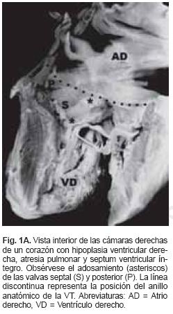 La denominación de atresia pulmonar con septum ventricular íntegro es reduccionista, ya que hace referencia sólo al estatus de la válvula y del tabique ventricular y no dice nada acerca de la patología del ventrículo derecho. Por ello preferimos emplear el término de hipoplasia que sí da cuenta de las alteraciones presentes en las tres porciones del ventrículo derecho: entrada, trabeculary salida. Esta cardiopatía congénita constituye un síndrome, que se manifiesta en forma de un amplio espectro de grados de severidad patológica. Generalmente cursa con atresia de la VP y en un menor número de casos con estenosis de esta válvula; en este trabajo se considera sólo el primer subgrupo. Para llamar hipoplásico a un ventrículo, éste debe tener constitución tripartita, por lo cual se excluyen los ventrículos derechos a los que les falta su porción de entrada como ocurre en la ausencia de conexión atrioventricular y en la doble entrada en ventrículo izquierdo, ya que son ventrículos incompletos y rudimentarios.