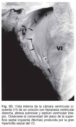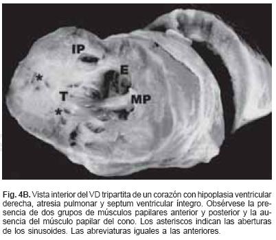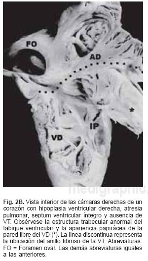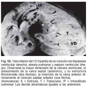 Existe un espectro en relación al tamaño de la cavidad del VD que está regulado por dos parámetros, la hipertrofia parietal y las alteraciones de la VT. La atresia muscular del infundíbulo se correlaciona fuertemente con la presencia de un VD diminuto, mientras que la estenosis del mismo se correlaciona con tamaños mayores del VD de por sí pequeño. También existe una desproporción entre la gran hipertrofia y el tamaño pequeño del VD. En pocos casos no existe una obstrucción subvalvular y sólo está la válvula imperforada. En verdad la hipoplasia del VD está relacionada con la hipertrofia masiva de la pared ventricular.13 Las trabéculas son más pequeñas que lo normal y puede estar presente la fibroelastosis endocárdica en la cuarta parte de los casos. El grado de obliteración de la cavidad ventricular derecha por hipertrofia parietal de sus trabéculas ahora se utiliza en la clasificáción de los pacientes para el tratamiento quirúrgico. La hipertrofia muscular oblitera primero el componente apical y luego al infundíbulo, dejando solamente la entrada como cavidad efectiva.22