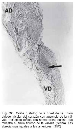 De los veinticinco corazones estudiados, dieciocho presentaron adosamiento de la VT a la pared ventricular (72%) constituyendo la anomalía de Ebstein (AE), dos de ellos tuvieron engrasamientos fibromixoides en los bordes de las valvas no adosadas (Figs. 1A y 1B); cinco especímenes sin AE (20%) presentaron engrasamientos fibromixoides (displasia grado I), acortamiento y engrasamiento de cuerdas tendinosas (displasia grado II) (Fig. 2A), dos corazones (8%) tuvieron ausencia de la VT en los cuales el orificio atrioventricular permeable sólo estuvo resguardado por el anillo fibroso con ausencia de valvas, cuerdas tendinosas y músculos papilares, la pared libre del VD careció de miocardio que fue reemplazado por tejido fibroso (displasia grado III) (Figs.2B y 2C).