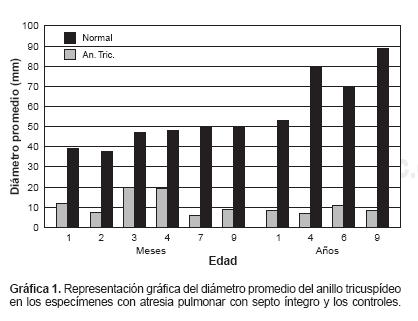 En veintitrés corazones el anillo de la VT fue estenótico (Figs. 3C y 4A) y en dos estuvo dilatado (Fig. 2B). En todos los corazones el tamaño de esta válvula fue proporcional a las dimensiones del VD. Los perímetros del anillo valvular estuvieron reducidos de 6 a 10 veces en relación con los valores normales obtenidos de corazones de edades equivalentes (Tabla I) (Gráfica 1).
