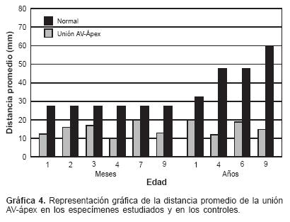 Se estudiaron 25 especímenes anatómicos portadores de esta malformación, pertenecientes a la colección de corazones con cardiopatía congénita del Departamento de Embriología del Instituto Nacional de Cardiología <<Ignacio Chávez>>. Cada corazón fue analizado morfológicamente siguiendo los pasos del sistema secuencial segmentario;15 se consideró la estructura tripartita del ventrículo para abordar independientemente cada una de las porciones: entrada, trabecular y salida. El análisis se centró en la porción de entrada que alberga a la VT; se midieron circunferencia del anillo valvular, grosores de las paredes del VD anterior y posterior del septum ventricular, así como el grosor de la pared anterior del infundíbulo. Se determinaron las distancias AV-A y A-VP; los valores obtenidos se compararon con los correspondientes determinados en corazones normales de edades equivalentes.16-18 Se cuantificó el número de valvas, patrón de inserción de cuerdas tendinosas y el grado de desarrollo de los músculos papilares; los grados de displasia y adosamiento valvares se determinaron según los criterios de Becker y cols.19