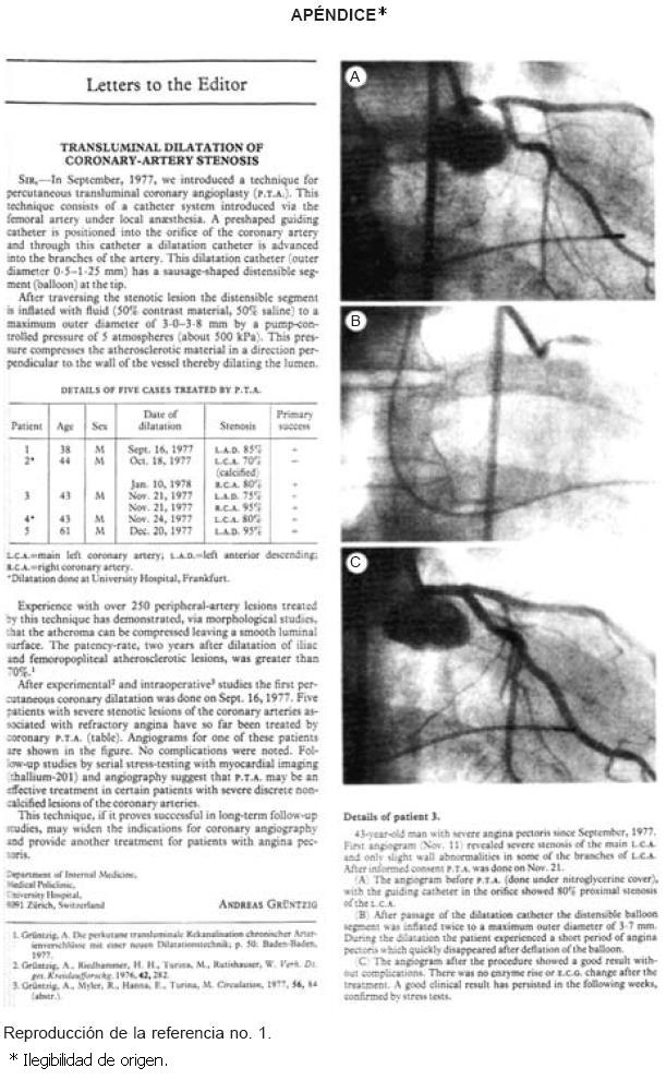 El viernes 16 de septiembre de 1977 Andreas Gruentzig realizó exitosamente la primera angioplastía coronaria transluminal percutánea en un paciente despierto.1 Este evento es histórico porque fue el que abrió en definitiva las puertas para el tratamiento percutáneo de numerosas enfermedades cardiovasculares, transformando con ello de forma contundente el ejercicio de la cardiología. A treinta años de esa fecha no sena exagerado dividir la historia de la cardiología moderna en antes y después de la introducción de la angioplastía coronaria. Tal impresión la ilustra bien uno de los libros de texto de cardiología con mayor difusión mundial. Cuando apareció su primera edición en 1980, éste le concedió a la angioplastía coronaria un párrafo de 9 líneas.2 En cambio, en su última edición de hace dos años, le dedica ahora capítulos completos tan solo para su aplicación en la angina estable y en el infarto agudo del miocardio, así como consideraciones extensas en el capítulo de angina inestable y en los subcapítulos correspondientes a las guías de tratamiento para los síndromes isquémicos, amén de examinar el papel de la "terapia transcatéter" a lo largo de los apartados que versan sobre las demás patologías que actualmente son susceptibles de este tratamiento.3