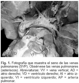 En todos los especímenes el SVP estuvo independiente, separado del atrio izquierdo y ubicado por detrás y un poco por encima de esta cámara cardíaca incompleta y pequeña (Figs. 1 y 2). El SVP se continuó con un vaso colector que siguió diferentes trayectos según el sitio de conexión anómala; en el tipo a vena cava superior el colector ascendió por detrás del bronquio derecho o del izquierdo según la posición de esa vena; en dos especímenes la obstrucción del colector fue intrínseca por estrechez del mismo en el sitio de su desembocadura (Figs. 3A y 4) y en un espécimen el colector siguió un trayecto anómalo entre la rama derecha de la arteria pulmonar y el bronquio derecho lo que provocó obstrucción extrínseca en el mismo (Fig. 3B). En el sitio de conexión anómala a la vena vertical el SVP recibió las venas de ambos pulmones y a través de un colector corto se continuó con la vena vertical ubicada del lado izquierdo, ésta a su vez lo hizo con el tronco venoso braquiocefálico izquierdo que desembocó en la vena cava superior y ésta en el atrio derecho (Fig. 5); en un espécimen existió obstrucción intrínseca en la vena vertical (Fig. 6).