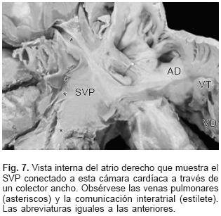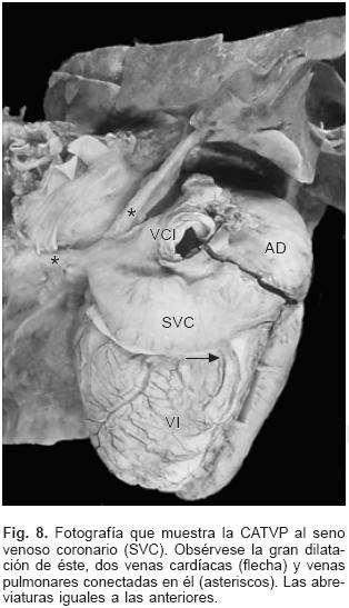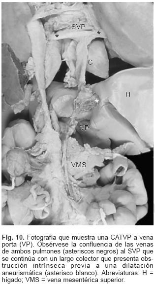 En la CATVP al atrio derecho el SVP se integra en la parte posterosuperior de esta cámara a través de un colector muy corto (Fig. 7). En el sitio de conexión al seno venoso coronario el colector venoso desembocó en el extremo izquierdo de dicho seno el cual estuvo dilatado (Figs. 2 y 8). El orificio de desembocadura del seno venoso coronario en el atrio derecho fue muy amplio y se situó por debajo de la comunicación interatrial (Fig. 9). En un espécimen existió estrechez intrínseca del colector en el sitio en que se unió al seno venoso coronario. En la conexión anómala infradiafragmática el SVP recibió las venas de ambos pulmones y se continuó con un colector largo que acompañó al esófago, atravesó el hiato esofágico y descendió hasta desembocar en la vena porta justo antes de penetrar al hígado (Fig. 10). Todos los corazones de este grupo presentaron obstrucción extrínseca a nivel del hiato esofágico y en dos especímenes se agregó obstrucción intrínseca en el colector antes de su desembocadura en la vena porta (Fig. 10).