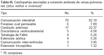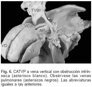 Los ciento seis corazones estudiados representaron el 8.15% de los mil trescientos especímenes anatómicos con cardiopatia congenita de la colección patológica. Setenta y tres (68.87%) tuvieron situs sólitas, treinta (28.30%) dextroisomerismo y tres (2.8 %) situs inversas. La frecuencia de los niveles de CATVP fue mayor en el supradiafragmático seguido del grupo mixto y del infradiafragmático. Las frecuencias a vena cava superior, vena vertical y seno venoso coronario fueron similares con ligero predominio en la primera (Tabla II).