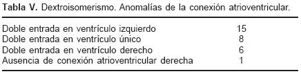 En el grupo mixto el trayecto de los colectores provenientes de cada pulmón dependió de los sitios de conexión anómala (Tabla II). Los setenta y tres corazones en situs solitus e inversas presentaron un defecto septal interatrial de tipo orificio oval (Figs. 2, 4, 7 y 9), mientras que en los treinta corazones con dextroisomerismo existió un atrio común y una bandeleta septal interatrial que separó dos grandes comunicaciones (Fig. 11). Todos los corazones presentaron dilatación de las cámaras derechas, del tronco y ramas de la arteria pulmonar así como hipertrofia del ventrículo derecho (Fig. 12). Respecto a las cámaras izquierdas el atrio fue pequeño e incompleto por carecer del SVP (Fig. 2), el ventrículo izquierdo y la válvula mitral tuvieron características normales. Las cardiopatías asociadas en los setenta y seis corazones con situs solitus e inversus se consignan en la Tabla III. Los treinta corazones con dextroisomerismo presentaron un patrón complejo de asociación de anomalías intracardíacas y vasculares (Tabla IV); en las Tablas V y VI se muestran respectivamente los tipos de conexión atrioventricular y ventriculoarterial en dextroisomerismo.
