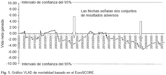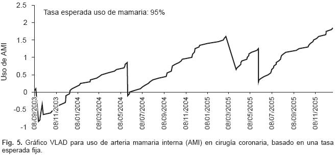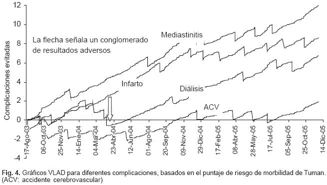 Results: VLADs based on riskadjusted morbidities and mortality could identify several clusters of adverse results, occurring at different periods of time, as well as its temporal relations. In the same way, it could be determined along the series, the net lives saved, the complications avoided and the internal thoracic artery graft usage.