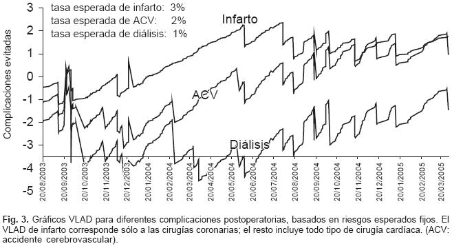 Las curvas de mortalidad acumulada estratificadas por riesgo (curvas cusum),67 y su variante, los gráficos variables ajustados por vida (VLAD = variable lifeadjusted display)810 ofrecen una herramienta para la monitorización continua de los resultados quirúrgicos, y son fácilmente adaptables al seguimiento de diferentes eventos. Los VLAD incorporan información sobre los resultados favorables y desfavorables de cada paciente operado, teniendo en cuenta el riesgo previo estimado para cada caso, basado en algún modelo predictor de riesgo. El gráfico resultante muestra la diferencia entre la mortalidad prevista acumulada, o el riesgo acumulado de determinada complicación, y la tasa real de muertes o complicaciones ocurridas, de forma tal que la curva de "vida neta ganada" o de "complicaciones evitadas" se desplaza proporcionalmente por arriba o debajo del valor nulo ideal. El método VLAD es útil para el control de calidad, ya que puede aplicarse para probar de nuevas técnicas y detectar tempranamente de tendencias desfavorables en los resultados de la cirugía cardíaca. Derivado de los modelos que usa la industria para monitorizar la calidad de una producción en línea, el VLAD también es capaz de señalar las consecuencias de los cambios introducidos en un proceso, como podría ser la incorporación de nuevos cirujanos o personal auxiliar, la aplicación de nuevas técnicas como la cirugía "sin bomba" (curva de aprendizaje) o el cambio de gerenciamiento o dirección de un servicio o institución. Estas modificaciones se expresan en la línea continua del gráfico VLAD, como caídas o valles (o ascensos bruscos) denominados "conglomerados", y que señalan la ocurrencia temporal del fenómeno y su tendencia final. Este seguimiento caso por caso revela rápidamente las consecuencias sobre la calidad de los resultados, e induce a analizar y prescribir las decisiones y acciones correctivas adecuadas. El objetivo de este estudio fue demostrar la utilidad de un modelo de control de calidad basado en la monitorizacion continua de la incidencia de complicaciones y muertes con gráficos VLAD, en una serie de cirugías cardíacas.