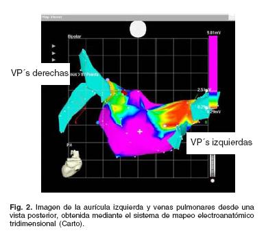 En los casos de FA crónica, se emplea un abordaje mixto, inicialmente "anatómico" y posteriormente electroñsiológico. Para ello, una vez que se accesa a la aurícula izquierda de la manera antes descrita, se realiza un mapa electroanatómico tridimensional de la aurícula izquierda y de todas las VPs (Carto, Biosense Webster, EUA). Para ello es muy útil como guía las imágenes obtenidas previamente mediante resonancia magnética o tomografía computada (Fig. 1). Una vez completado el mapa, se realiza el aislamiento grupal de las VP's derechas y después se aislan las VPs izquierdas (el orden es indistinto).