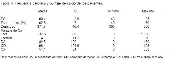 La densidad media de contraste intracoronario alcanzado fue de 371 UH. La media del puntaje total de calcio fue de 237.5 UA, predominando en la coronaria derecha con una media de 98.4 UA y en la arteria descendente anterior con una media de 84.5 UA (Tabla II).