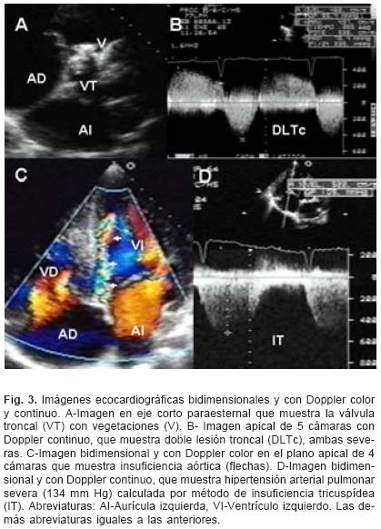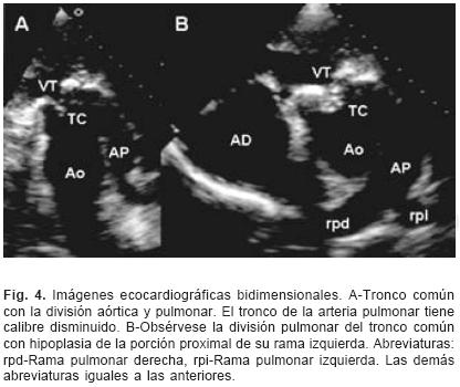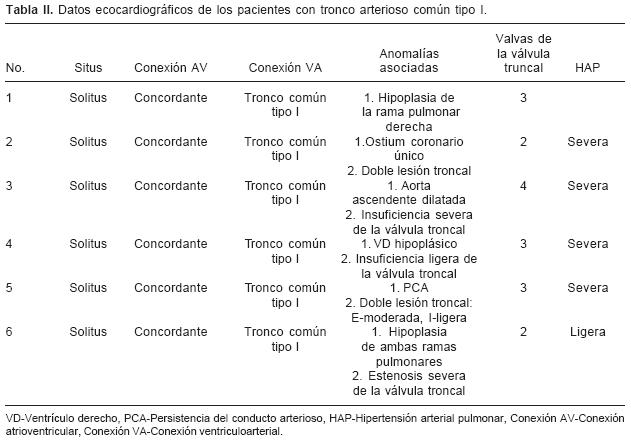 La válvula troncal fue tricúspide en el 50% de los pacientes, bicúspide en el 33% y tetracúspide en el 17% (Fig. 2). El 33% presentó doble lesión troncal, ambas severas, el 33% insuficiencia de la válvula troncal (1severa, 1ligera), uno de estos casos cursó con endocarditis bacteriana) (Fig. 3) y el 17% con estenosis severa de la válvula troncal. El 17% de los pacientes tuvo insuficiencia mitral y el 83% insuficiencia tricuspídea. El 83% presentó hipertensión arterial pulmonar (severa80% y ligera20%) (Fig. 3). Entre las anomalías asociadas se encontraron: hipoplasia de las ramas pulmonares en el 33% (Fig. 4) de los casos, ostium coronario único en el 17%, persistencia de conducto arterioso en el 17% y arco aórtico derecho en el 17%. Se encontró también disfunción sistolica biventricular en el 17% de los casos y disfunción diastólica de ventrículo izquierdo en el 33%. El 17% tuvo dilatación del ventrículo derecho, el 17% ventrículo derecho hipoplásico y el 17% dilatación de aorta ascendente (Tabla II).