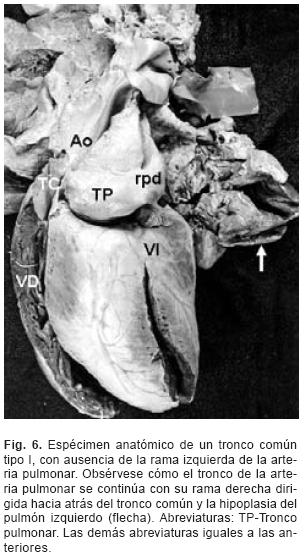 Las anomalías asociadas más severas se presentan en niños, en especial las malformaciones derivadas de los arcos aórticos del embrión como son anillos vasculares, interrupción aórtica, agenesia de una rama de la arteria pulmonar (Fig. 6), origen anómalo de la arteria pulmonar a partir de la aorta o estenosis del tronco pulmonar o de sus ramas, lo cual agrava el cuadro clínico y ensombrece el pronóstico.4,21 El estudio ecocardiográfico fue de gran utilidad en el diagnóstico no invasivo de tronco arterioso común tipo I y de las anomalías asociadas.10,19 La mayoría de los pacientes cursan con hipertensión arterial pulmonar como observamos en el 83% de nuestros pacientes.