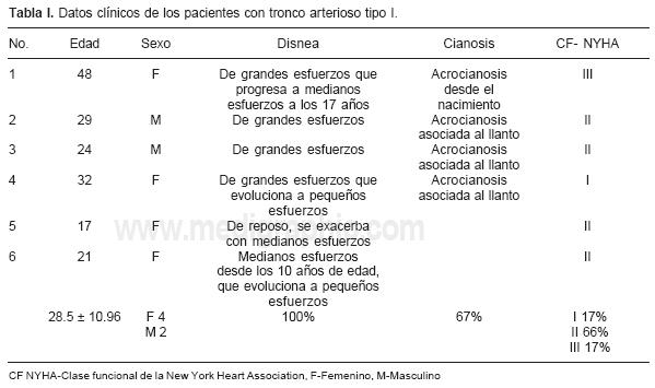 Todos los pacientes presentaron disnea de grandes esfuerzos desde el nacimiento, la cual en la segunda década de la vida, progresó a disnea de medianos esfuerzos en el 33% de los casos. La acrocianosis asociada al llanto se presentó desde el nacimiento en el 100% de los casos (Tabla I ).