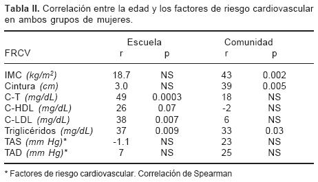 Las correlaciones entre la edad y los FRCV en los grupos de mujeres estudiados se muestran en la Tabla II. Estos resultados muestran que los FRCV y la edad se comportan de distinta manera entre estos grupos de mujeres y en cierta medida confirman las diferencias encontradas respecto a la prevalencia de estos factores. En el grupo de mujeres con mayor nivel educativo se identificó que la edad se correlacionaba de manera más fuerte y significativa con la mayoría de los lípidos estudiados, mientras que en las mujeres de menor nivel educativo, ambas medidas antropométricas mostraron correlaciones elevadas y significativas con esta misma variable.