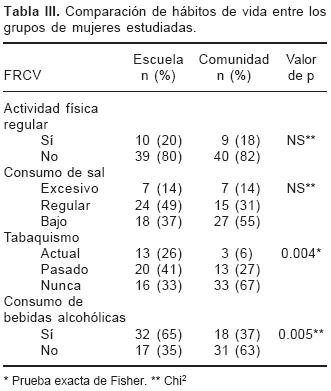 Con relación a presión arterial no se identificaron diferencias significativas ya que la prevalencia de hipertensión sistólica y diastólica fue igual en ambos grupos de mujeres (8% y 6% respectivamente).
