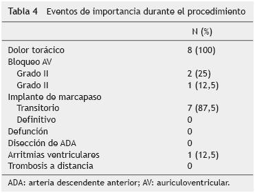 Todos los pacientes presentaron dolor torácico durante el procedimiento. Sólo uno requirió de la administración de una dosis de meperidina después de la oclusión arterial. Un paciente presentó una extrasistolia ventricular frecuente durante los primeros minutos de infusión de etanol, que desapareció de forma espontánea minutos después (tabla 4).