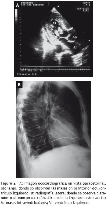 Según Yang et al 9, el diagnóstico de un CE intracardíaco no es difícil si nos basamos en la anamnesis y el examen físico combinado con la radiografía y el ecocardiograma; sin embargo, en nuestro paciente no ocurrió así: sólo había referido el traumatismo torácico, permaneció sin síntomas cardiovasculares durante varias semanas, no tenía antecedentes de la realización de ninguna maniobra invasiva, ni de la colocación de algún dispositivo permanente y no presentaba cicatriz alguna en la piel, sólo durante la cirugía se palpó la presencia de tejido cicatricial en el quinto espacio intercostal izquierdo.