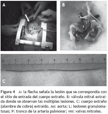El caso publicado por Yang et al 9 es el que más se asemeja al nuestro, pues el CE permaneció dentro del corazón durante 1 año. Sin embargo, su paciente era un niño de 11 años de edad con antecedentes de haberse caído de bruces e inmediatamente después de la entrada del CE, que él no percibió; presentó sangrado torácico externo que lo obligó a acudir a un hospital local, donde se diagnosticó y trató con éxito un hemoneumotórax. No obstante, a diferencia del caso que presentamos, su CE estaba en el septum interauricular.
