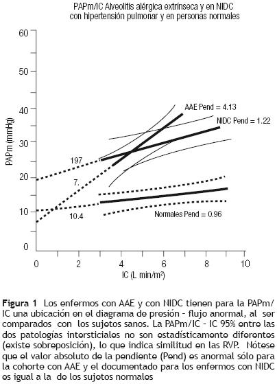 Los valores de la PAPm/IC en personas sanas se anotan en la Tabla 5. Tanto en los enfermos con AAE como en los portadores de NIDC el promedio de la PAPm fue anormal, comparada con la de sujetos sanos, sin diferencias para el IC. La pendiente estuvo incrementada en AAE y fue similar para aquellos con NIDC. La ubicación en el diagrama de presiónflujo de la PAPm/IC para las poblaciones con AEE y NIDC fue diferente de la normal (p < 0.001), sin guardar diferencias entre estas dos enfermedades (ya que existió sobreposición de las PAPm/IC IC 95%), (Tabla 5, Figura 1).