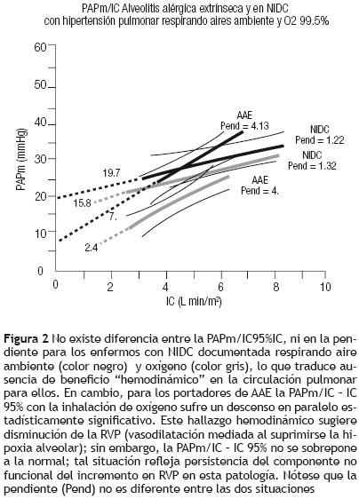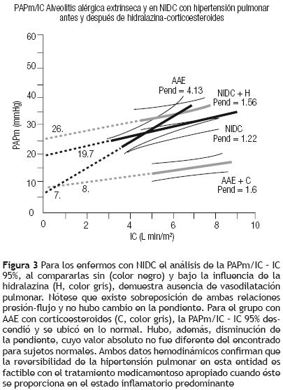 Resultados: El material histológico demostró que el estadio inflamatorio era predominante (con fibrosis mínima) para los enfermos con AAE y el de fibrosis (que se catalogó de moderada) sobre el inflamatorio para aquellos con NIDC, anomalías histológicas que se vieron asociadas a grados I y II de lesión vascular, respectivamente. La PAPm/IC tuvo ubicación anormal en el diagrama de presiónflujo (p < 0.01), situación que se vio asociada a hipoxemia, disminución de la saturación de la sangre venosa mezclada de oxígeno y anormalidades de la mecánica pulmonar en ambas cohortes. Para los enfermos con AAE se documentó una pendiente anormal (Pend: 4.13; IC 95%: 3.424.84 mmHg/L/min/m2; p < 0.01) con valor normal para la Pext (7 ± 1.9 mmHg). De manera opuesta, para los enfermos con NIDC la Pend fue normal (1.22; IC 95%: 0.471.99 mmHg/L/min/m2) y la Pext fue anormal (19.7 ± 3.5 mmHg, p < 0.01). Durante la AAO299.5% para los enfermos con AAE la Pend no se modificó (4.0; IC 95%: 3.184.82 mmHg/L/min/m2); sin embargo, se vio asociada con un descenso significativo de la PAPm/IC en paralelo, al ser comparada con la documentada RAA (p < 0.01). Sin embargo, esta caída no se ubicó en la posición normal para la PAPm/IC. Para los enfermos con NIDC no hubo diferencias en la Pend, en la ubicación de la PAPm/IC o para la Pext cuando se compararon con las documentadas RAA. Se presentó un comportamiento similar para estos parámetros bajo la influencia de H, en relación con la condición control. Para el grupo con AAE, después de la prescripción con corticoesteroides a largo plazo, se observó normalización tanto de la Pend (1.6; IC 95%: 0.912.29 mmHg/L/min/m2), como en su ubicación, lo que se vio asociado con la normalización de los parámetros de la mecánica pulmonar y del intercambio gaseoso.