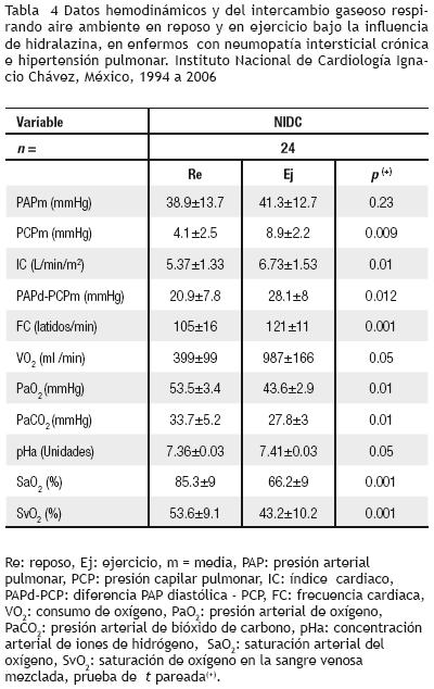 Para enfermos con NIDC en el reposo se observó un incremento de la PAPm, del IC y del VO2 respecto a los del reposo sin la acción de hidralazina (p < 0.01, para todas las comparaciones). Durante el ejercicio bajo la acción de hidralazina la PAPm no se modificó (Tabla 4).