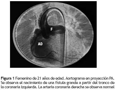 Material y métodos: Se presenta la experiencia que tuvo lugar entre el año 2000 y 2007 en un hospital de concentración de cardiología de enfermos con fístula coronaria, demostrada por coronariografía selectiva. Se incluyeron siete casos, tres adultos y cuatro niños; la media de edad de los niños fue de 6.5 años y la de los adultos de 25.6 años. En tres de los pediátricos, la fístula se originó de la coronaria izquierda y terminaban dos en la arteria pulmonar y uno en la aurícula derecha, en tanto que la originada en la coronaria derecha terminó en el ventrículo derecho. En los tres adultos, el origen fue en la coronaria derecha, dos de ellas abrían al ventrículo derecho y la otra terminaba en el seno coronario. Dos niños se operaron con éxito y están asintomáticos a 1 y 4 años de la operación, mientras que el adulto operado tuvo un infarto diafragmático no complicado 4 semanas después de la operación. Se hizo una revisión del tema en la literatura y se contrastó con lo visto en esta serie.