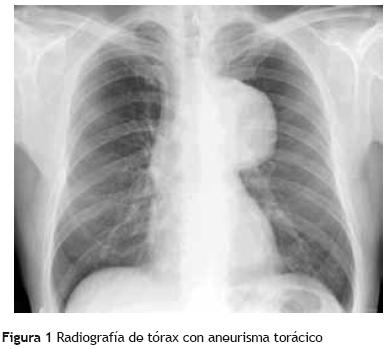 Los Rx de tórax, tomados con equipo portátil, evidenciaron tejidos blandos, óseo y pulmonar aparentemente sin alteraciones; la silueta cardiaca estaba respetada, con ensanchamiento mediastinal secundario a gran dilatación aneurismática del cayado aórtico (Figura 1).