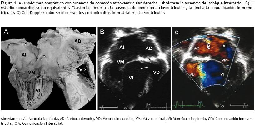 La ausencia de conexión atrioventricular es una cardiopatía congénita en la que un atrio no mantiene continuidad con su ventrículo1,2 y se le considera en el sistema secuencial segmentario como un tipo de conexión atrioventricular dentro del supertipo de conexión atriouniventricular.3 No existe la válvula tricúspide y el piso del atrio derecho es de estructura muscular; el ventrículo derecho carece de porción de entrada como consecuencia de la ausencia de conexión y sólo posee porciones trabecular y de salida, de ésta última emerge una arteria. El ventrículo izquierdo presenta hipertrofia y dilatación, es un ventrículo tripartita que posee la entrada (válvula mitral) y porciones trabecular y de salida. Son obligadas una comunicación interatrial y una comunicación interventricular.