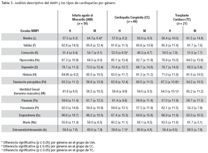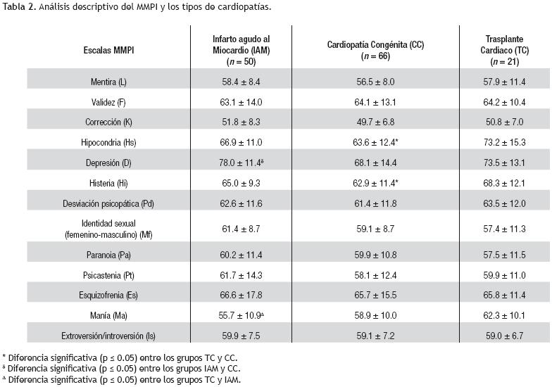 Methods. We evaluated 137 patients with congenital heart, acute myocardial infarction (AMI) or awaiting a heart transplant who came to the National Institute of Cardiology Ignacio Chavez. We used multiphase Personality Inventory, which provides information on personality traits and psychopathology.