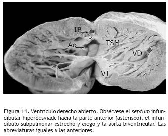 De los 35 corazones dos (5.71%) presentaron ausencia del septum infundibular, en ellos se observó continuidad fibrosa valvular entre las sigmoideas aórticas y el tejido valvular pulmonar empastado; los 33 corazones restantes (94.29%) mostraron una hiperdesviación del septum infundibular hacia la izquierda en sentido cefalad y anteriad (Figuras 6, 8, 10 y 11), de ellos 10 (30.3%) presentaron separación entre este septum y la pared anterior del infundíbulo (Figuras 6, 8, y 11), mientras que en los veintitrés restantes (69.7%) ocurrió fusión entre ambos elementos infundibulares (atresia infundibular) (Figura 10). De los 35 corazones, uno (2.86%) presentó ventrículo único y 34 (97.14%), dos ventrículos, en éstos últimos la comunicación interventricular fue infundibular posterior (subaórtica) de los cuales catorce (41.18%) tuvieron bordes musculares (Figuras 6 y 10) y 20 (58.82%), mostraron extensión perimembranosa (Figura 11). El pliegue infundibuloventricular estuvo presente en catorce corazones (41.18%) en los que existió discontinuidad valvular aortotricuspídea y en 20 corazones (58.82%) estuvo ausente en los que hubo continuidad aortotricuspídea.