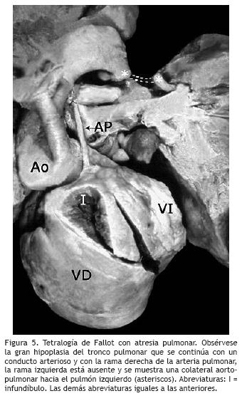 Se considera a la tetralogía de Fallot con atresia pulmonar como la expresión patológica más severa de esta cardiopatía troncoconal.15 Esta malformación cardíaca extremadamente heterogénea se caracteriza por la ausencia de comunicación entre el ventrículo derecho y el tronco de la arteria pulmonar que es secundaria a una obstrucción total localizada a nivel del infundíbulo del ventrículo derecho y/o de la válvula pulmonar; existe además una comunicación interventricular infundibular posterior (subaórtica) con aorta que puede ser biventricular o nacer completamente del ventrículo derecho.