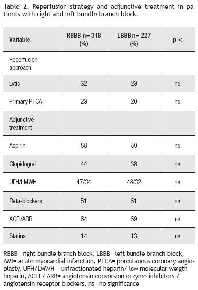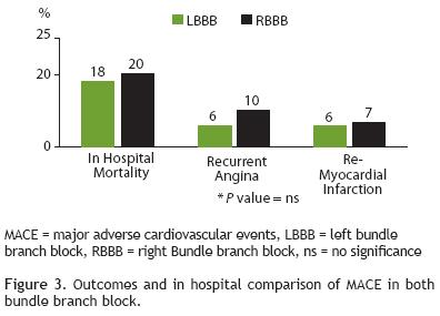 Resultados: No hubo deferencia estadísticamente significativa en ambos grupos en relación con características basales, tiempo de isquemia, localización del infarto, disfunción ventricular o estrategia de reperfusión utilizada. Los pacientes con infarto agudo del miocardio de cualquier localización y bloqueo de rama derecha tuvieron mayor tendencia para mortalidad hospitalaria y eventos cardiovasculares mayores (OR 1.70, IC 1.192.42, p < 0.003) vs. pacientes con bloqueo de rama izquierda.