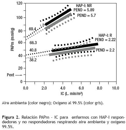 2. Inhalando O2 al 99.5%: Al comparar las PAPm de los grupos control vs. las observadas respirando O2 no se documentaron cambios significativos de la misma para la población respondedora ni para la no respondedora. Tampoco hubo diferencias para los IC, ni para las pendientes. En relación a la ubicación en el diagrama de presiónflujo para la PAPm/IC y para Pext no hubo cambios (Tabla 5, Figura 2).