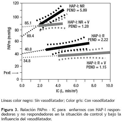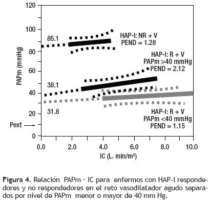 Consideraciones acerca de los criterios hemodinámicos para identificar en el reto agudo "respondedores": Con base en la información derivada del análisis de la PAPm/IC, utilizando el criterio propuesto en éste estudio es factible identificar la población respondedora que existe entre los enfermos con HAPI. Más también lo es de aplicarse el juicio promulgado por la Task Force de la Sociedad Europea de Cardiología.8 Se demostró que para aquellos que tienen la PAPm < 40 mm Hg bajo la influencia del vasodilatador no selectivo se caracterizan por estar ubicados en el diagrama de presión flujo por debajo de aquellos cuya PAPm finalmente es de > 40 mm Hg y que el valor absoluto de la PEND y el de Pext es menor. Sin embargo, de haberse aplicado el criterio de la Task Force de la Sociedad Europea de Cardiología8 sólo 8/20 se hubieran considerado como respondedores, siendo en realidad 20 enfermos con esta característica hemodinámica, lo que pudiera tener aplicaciones tanto para la terapéutica como al parecer para el pronóstico. El análisis estadístico comparativo de las PAPm/IC de los no vs. los sí respondedores avalan la opinión antes asentada. Sin embargo, por el número tan reducido de enfermos analizados no es factible señalar cuál es el mejor.